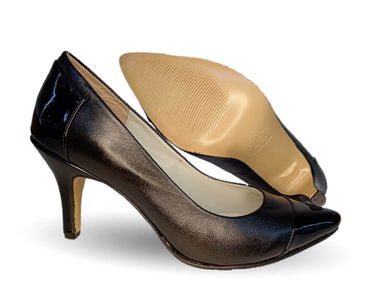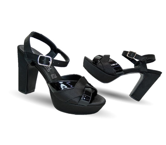 Sandalia con tacón medio D' Carol 5509 Shantung Negro/Charol Negro para mujer