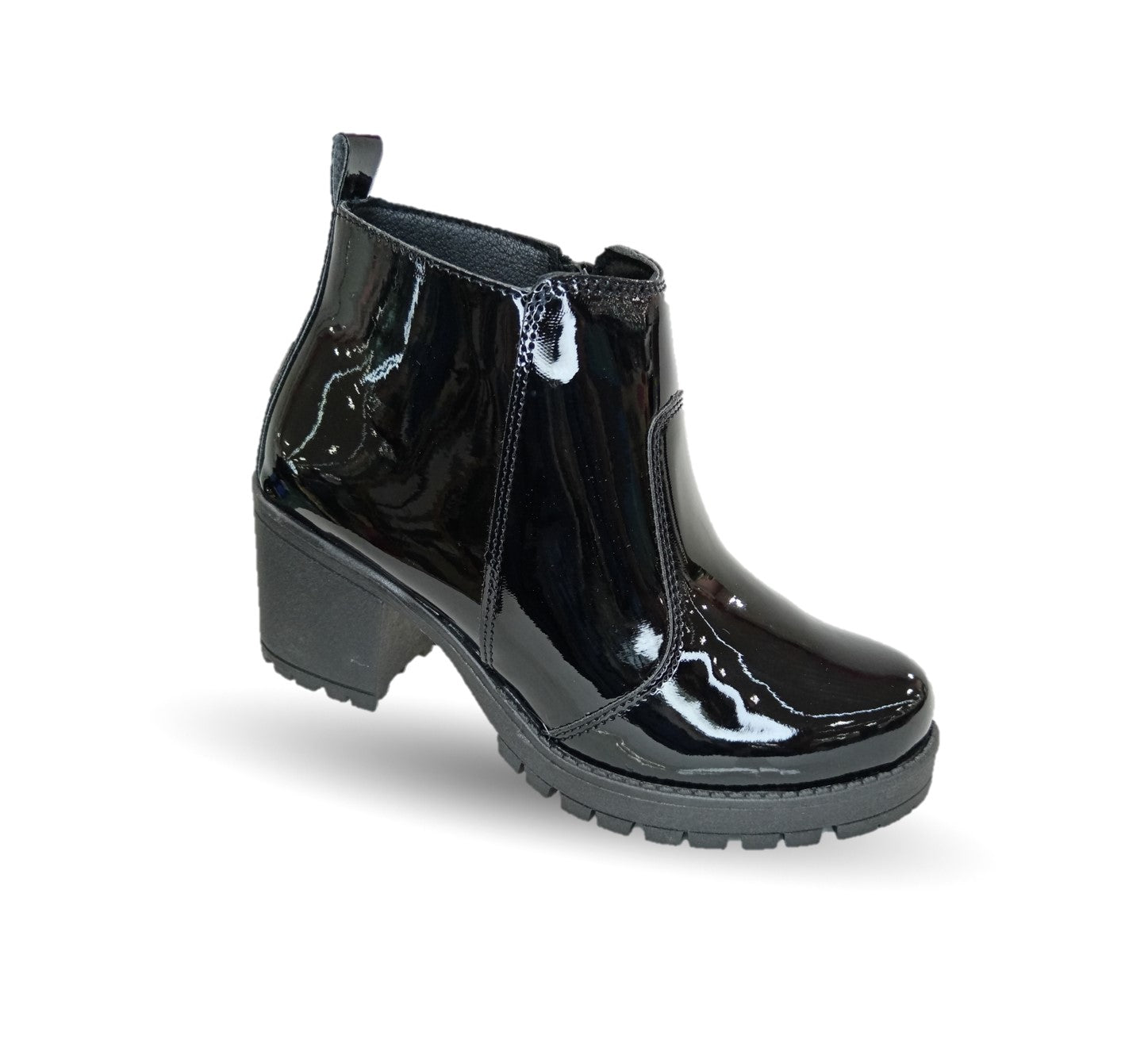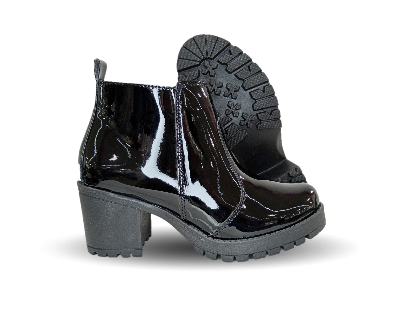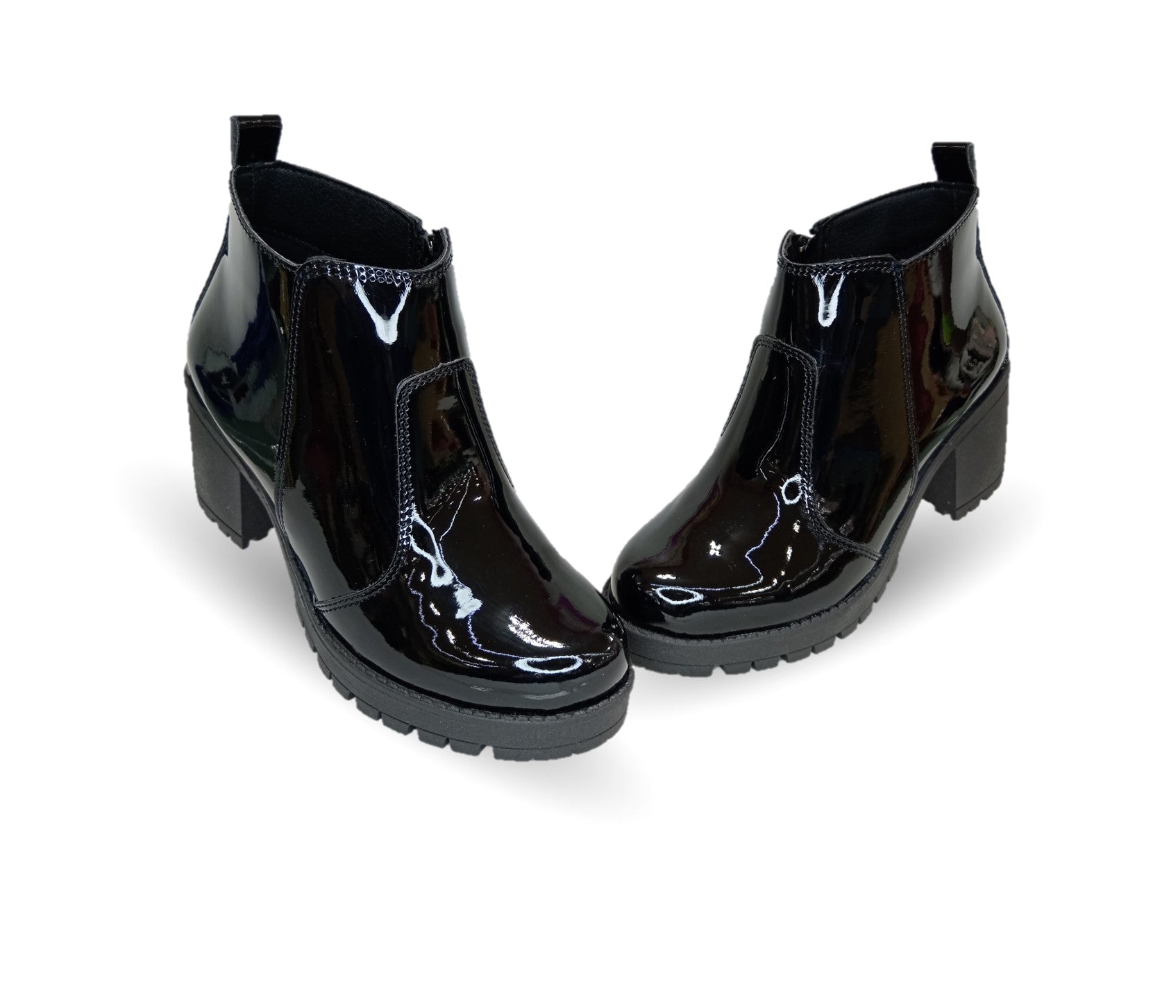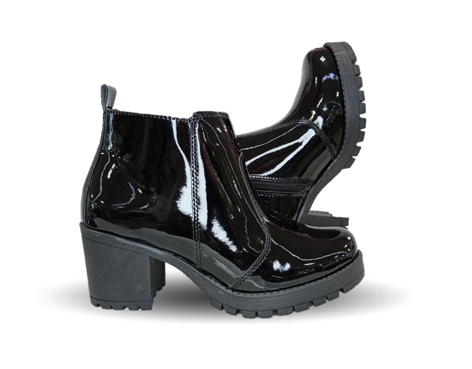 Especificaciones: Botín de moda en charol negro, forro textil para mayor comodidad y frescura, con ligera suela antiderrapante, altura 4.5 cms. Altura muy cómoda en este modelo básico para tu guardarropa. Cierre interno para mayor flexibilidad al usarlos.
