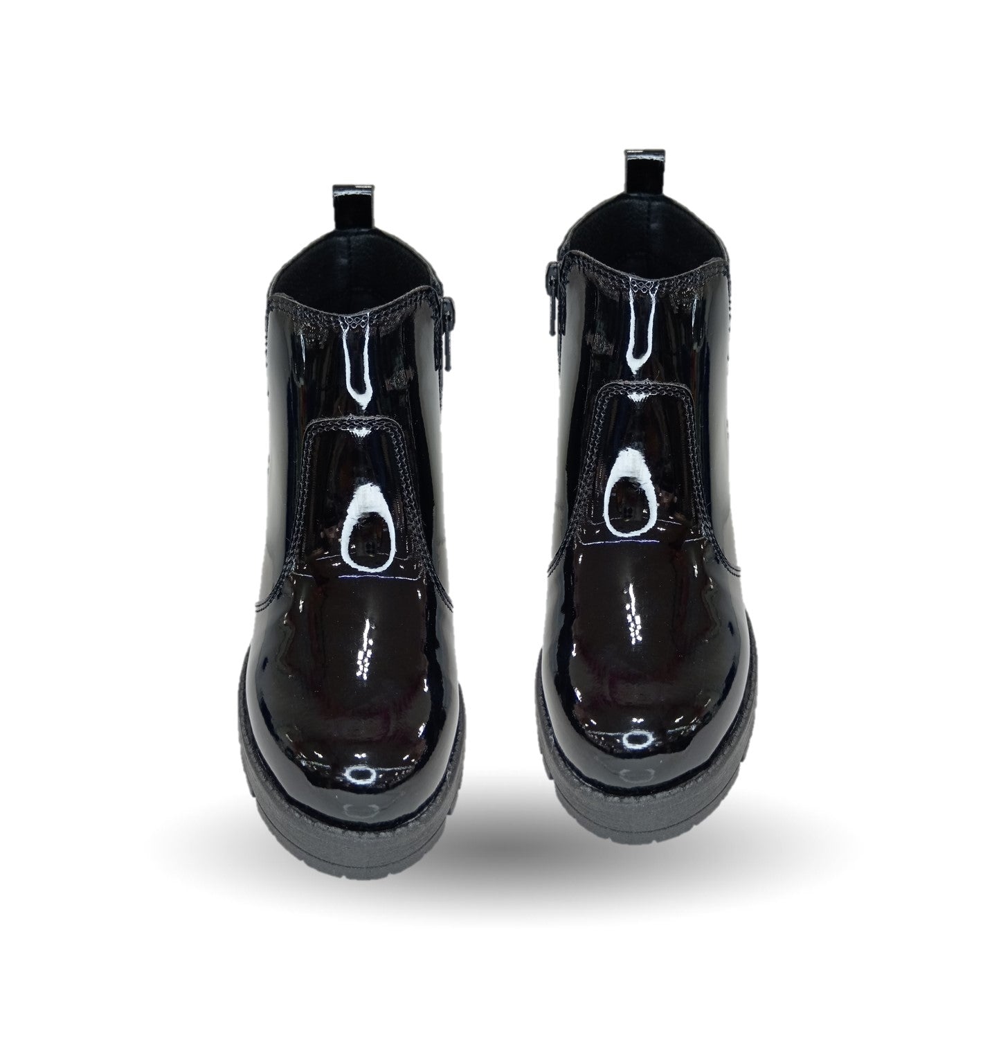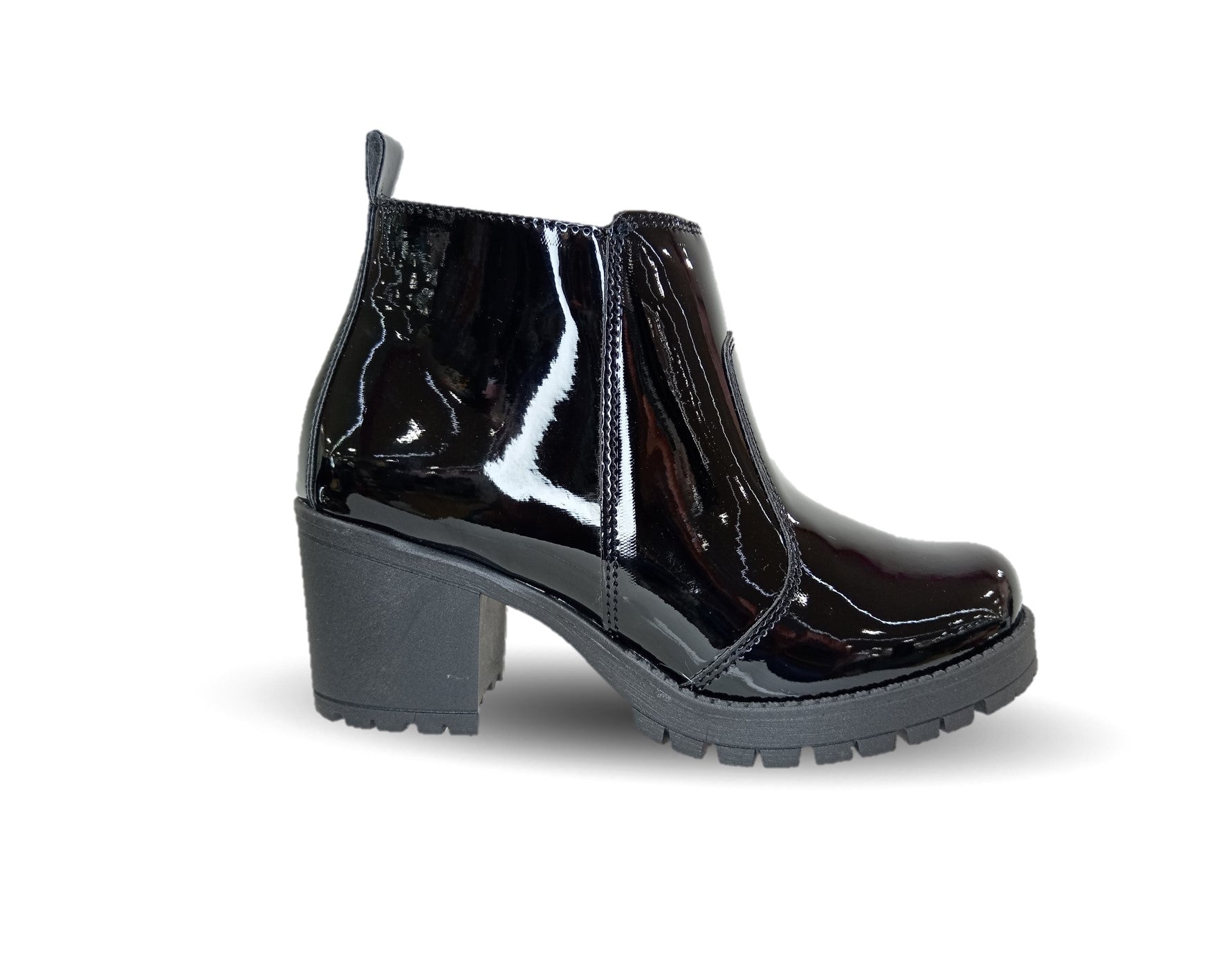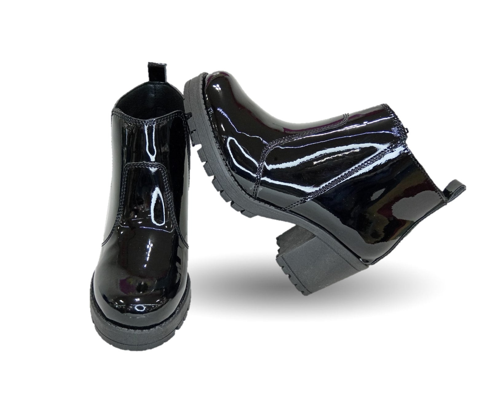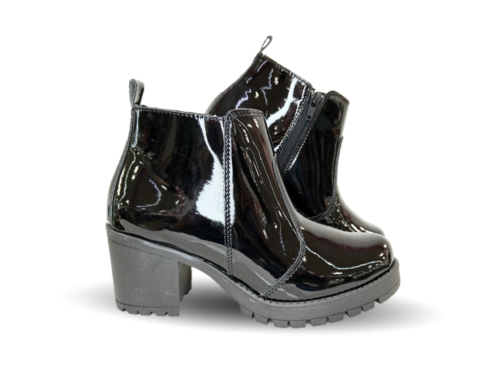 Especificaciones: Botín de moda en charol negro, forro textil para mayor comodidad y frescura, con ligera suela antiderrapante, altura 4.5 cms. Altura muy cómoda en este modelo básico para tu guardarropa. Cierre interno para mayor flexibilidad al usarlos.