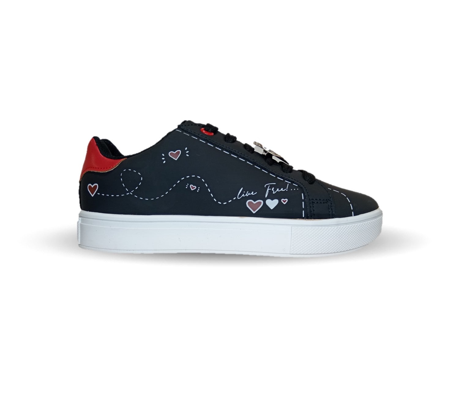 Especificaciones: Tenis urbano con corazones, agujetas para ajuste, forro y plantilla textil para mayor comodidad y frescura, suela antiderrapante.